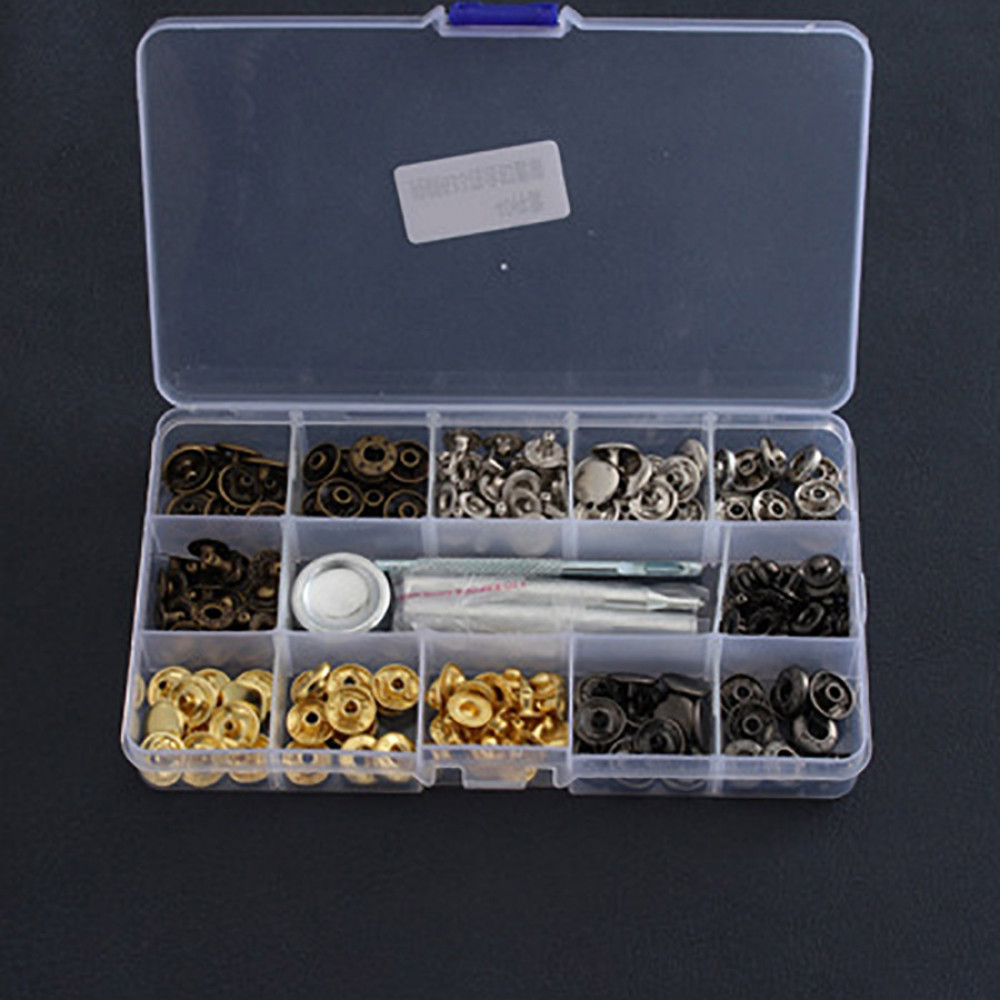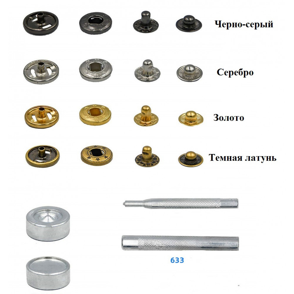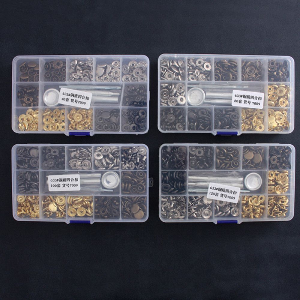 В наборе: 40 комплектов кнопок (состоят из четырех частей) 10 штук золото, 10 штук серебро, 10 штук черно-серый, 10 штук темная латунь и инструмент для установки (пробойник, 3 установщика, плашка)