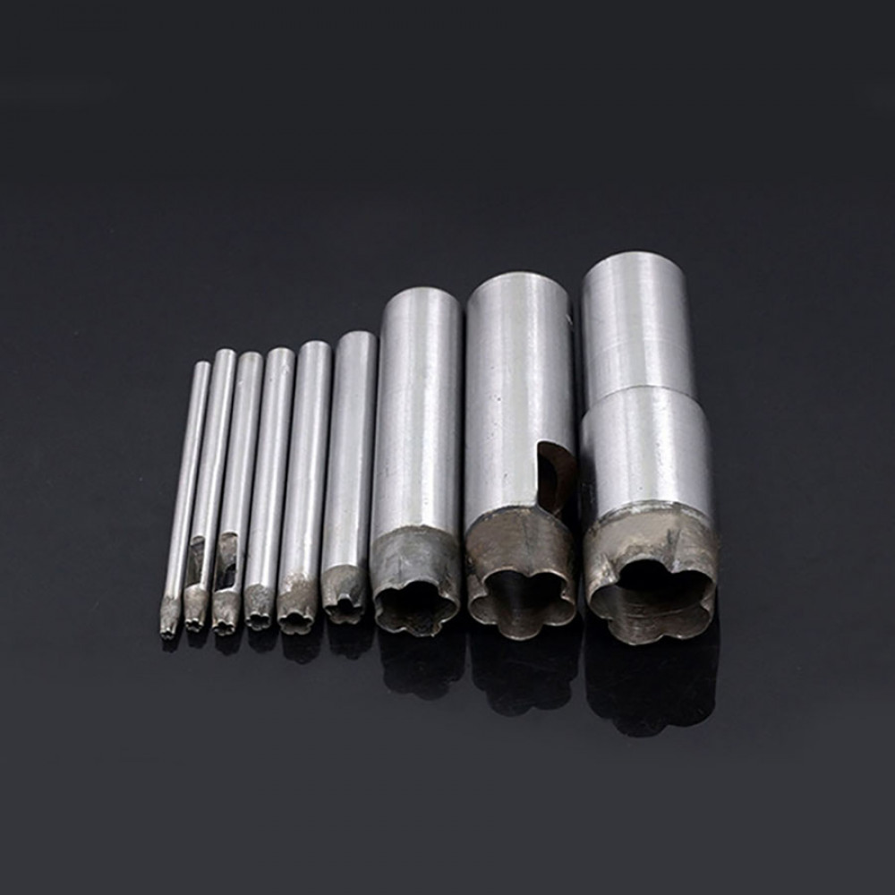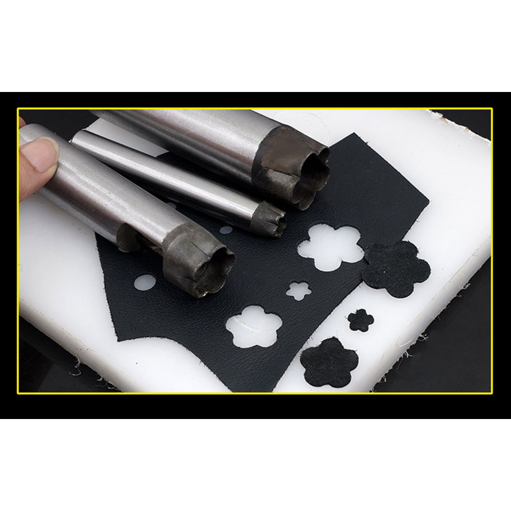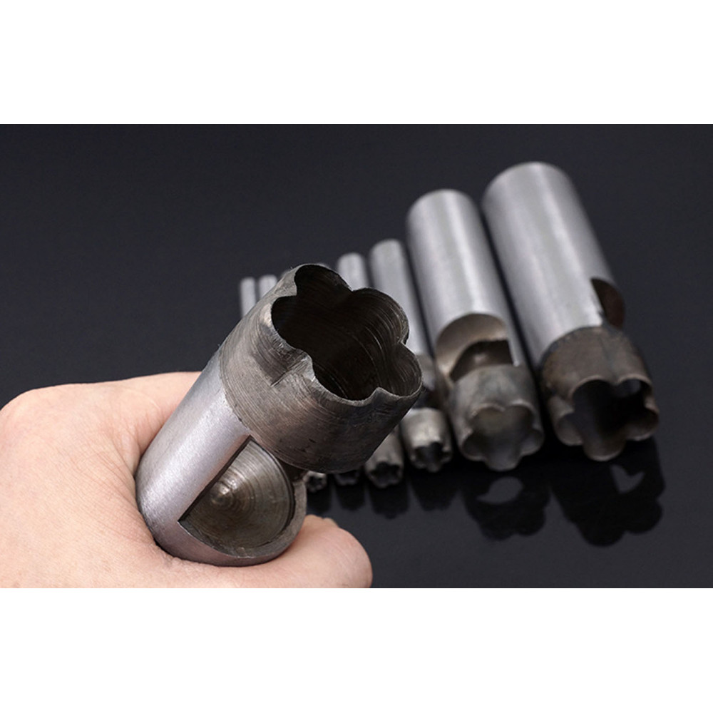 Пробойники фигурные разных размеров, для отверстий в форме цветка пятилистника. Пробойники часто используют при изготовлении кукольной обуви, ремней и других галантерейных изделий с декоративными отверстиями