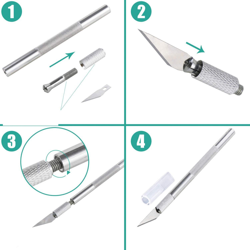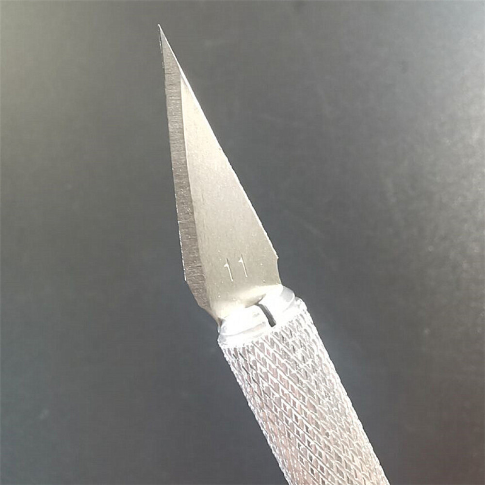 В набор входит 2 ручки-держателя лезвий, 30 лезвий трех форм, 1 алюминиевая линейка длиной 15 см.