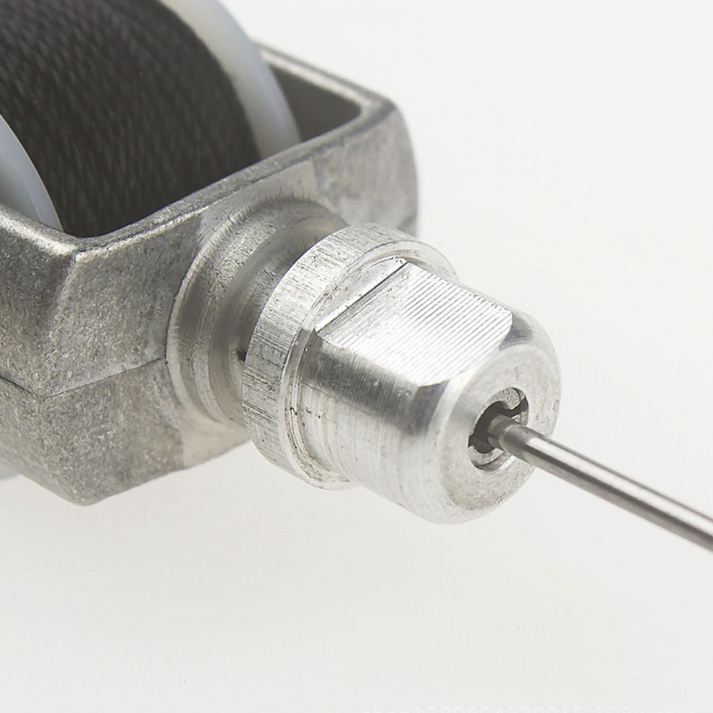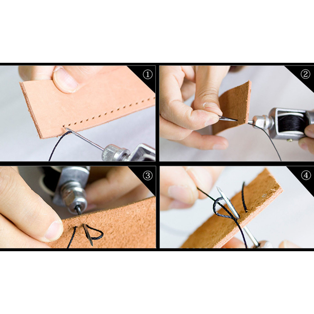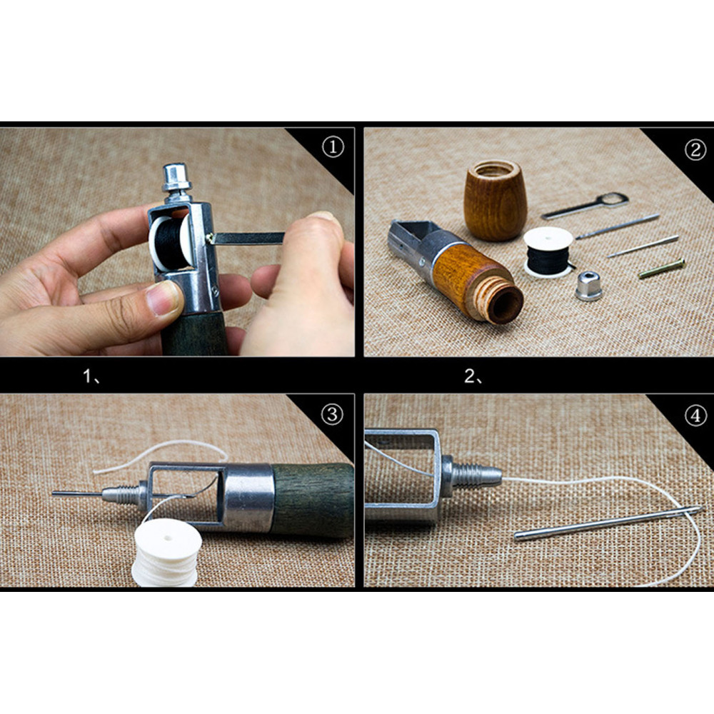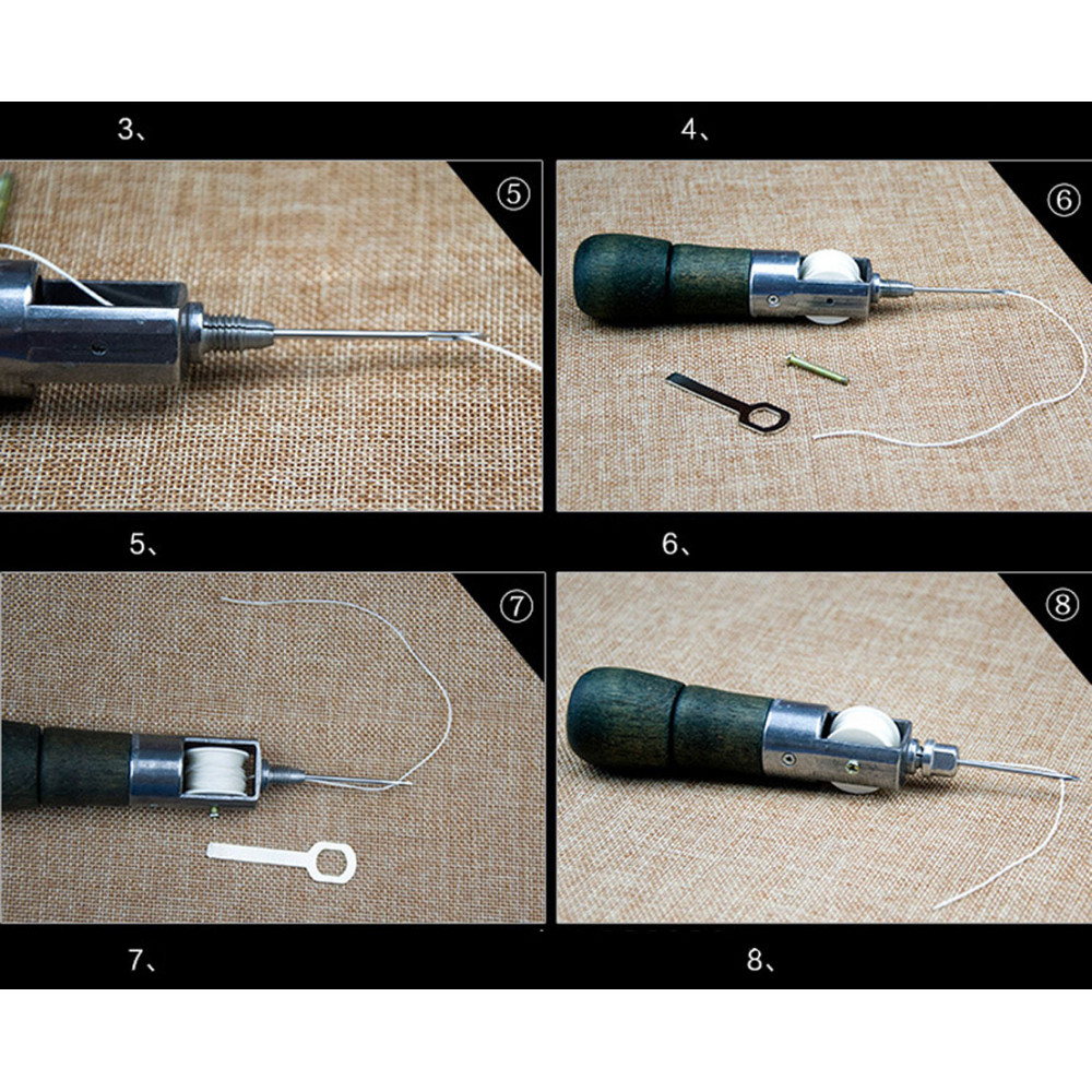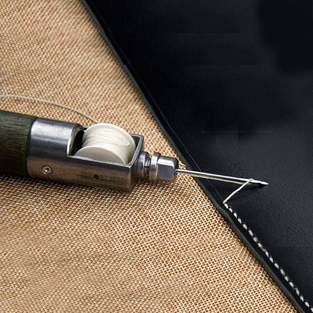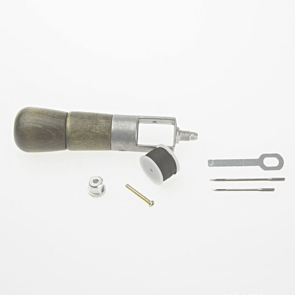 Ручная швейная машинка для шитья кожаных изделий ( (шило со шпулькой для ниток и цанговым зажимом для игл). При помощи данного устройства для шитья кожи можно прошивать несколько слоев ткани или плотные материалы (кожа, замша, мех, фетр, войлок и др.). Ручной инструмент сокращает время работы, позволяет выполнить аккуратные ровные швы.