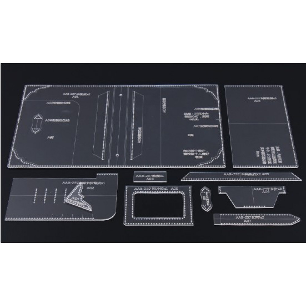 В комплект входят шаблоны всех деталей для изготовления кошелька. Заводские пластиковые шаблоны-выкройки удобны в работе, прослужат долго, позволят идеально ровно обвести лекало. Большое преимущество наших шаблонов - это наличие отверстий для разметки в кожаных деталях.