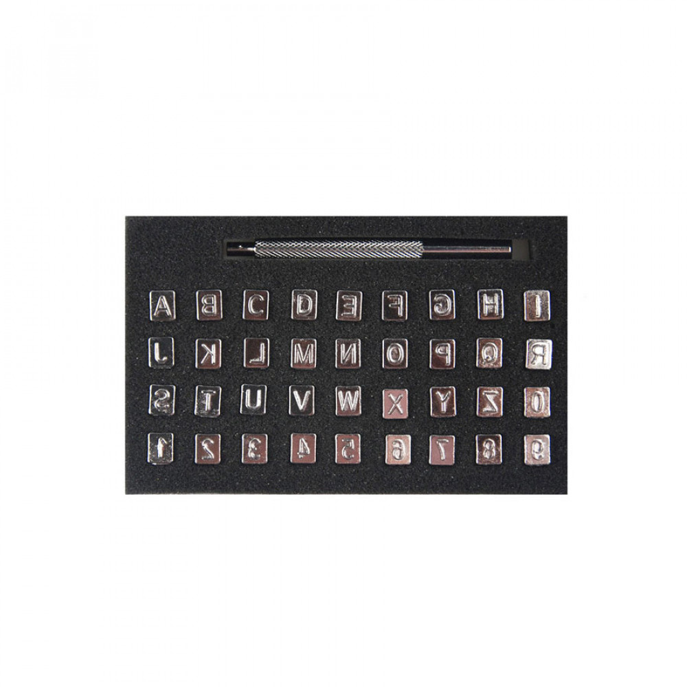 В наборе 36 штампов (буквы латинского алфавита) для нанесения логотипов и надписей.