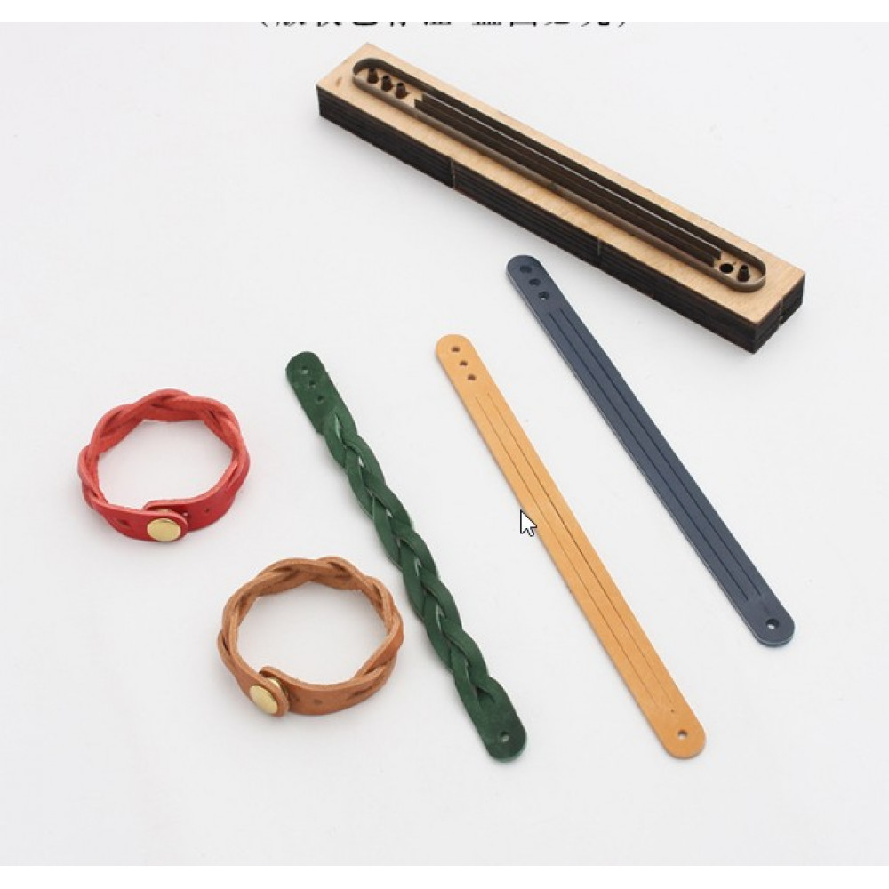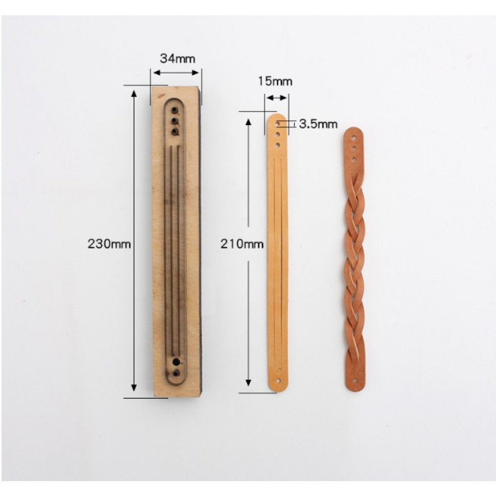 Вырубные штампы-штанцформы на деревянной основе. Позволяют получить готовую идеально ровную деталь. Данная штанц-форма позволяет быстро изготовить ремешок в виде косички. Кроме контура в форме есть пробойники под кнопку - благодаря трем отверстиям можно регулировать размер браслета. Инструкция по плетению - в дополнительных фото.