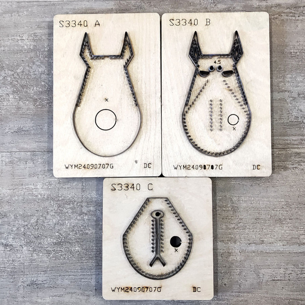 Данный набор из трех штанцформ предназначен для вырубки брелока / декора в виде головы собаки.
