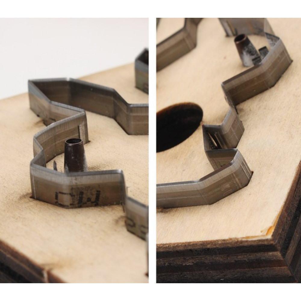 Для вырубки применяется специальный пресс либо Вы можете использовать ПЛАШКУ ДЛЯ ШТАНЦФОРМ или БИТУ.