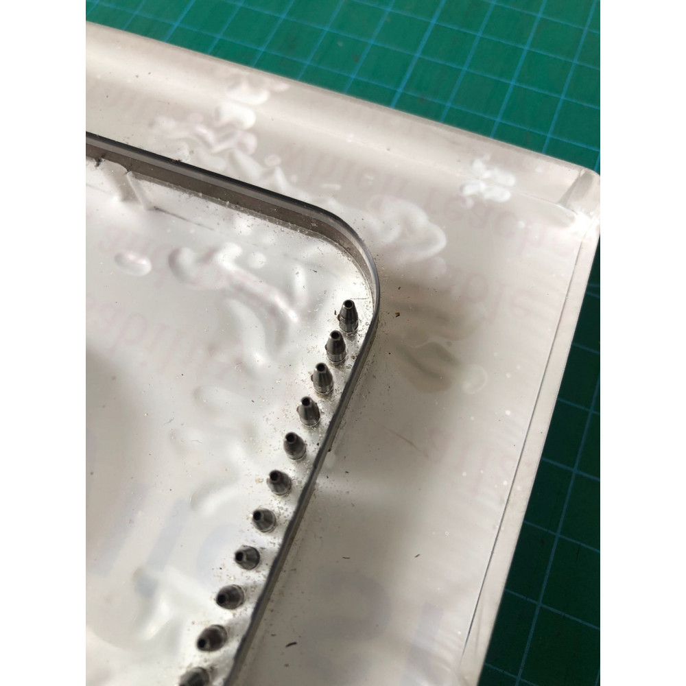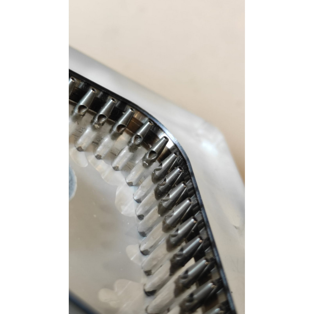 Отличительная особенность штанц-формы - наличие металлических вставок для высечки отверстий под шов! На дополнительных фото видны пробойники круглого сечения, шаг 5 мм. На выходе получается не только ровная, но и готовая для сшивания деталь. Акриловая основа позволяет значительно увеличить прочность и износостойкость штанцформы