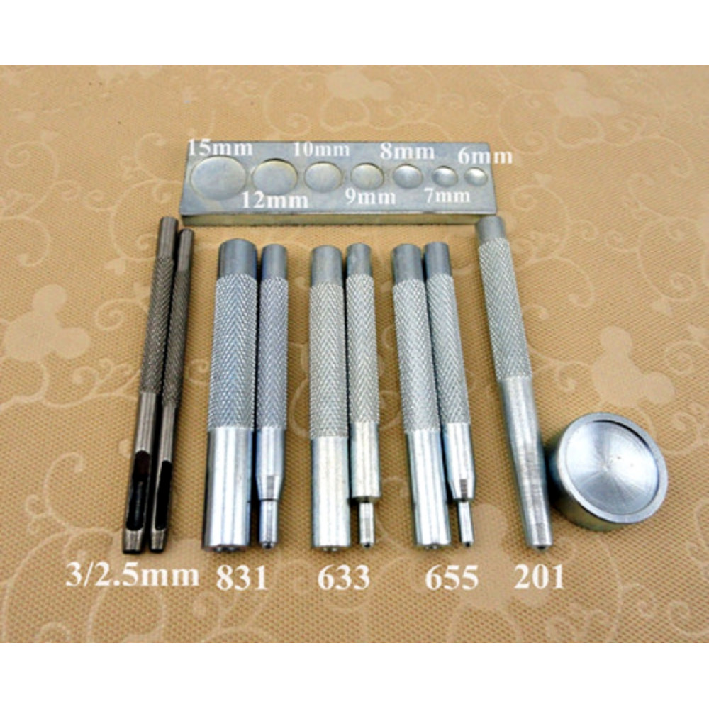 Набор из 11 предметов для ручной установки швейной фурнитуры – металлических кнопок разных типов.