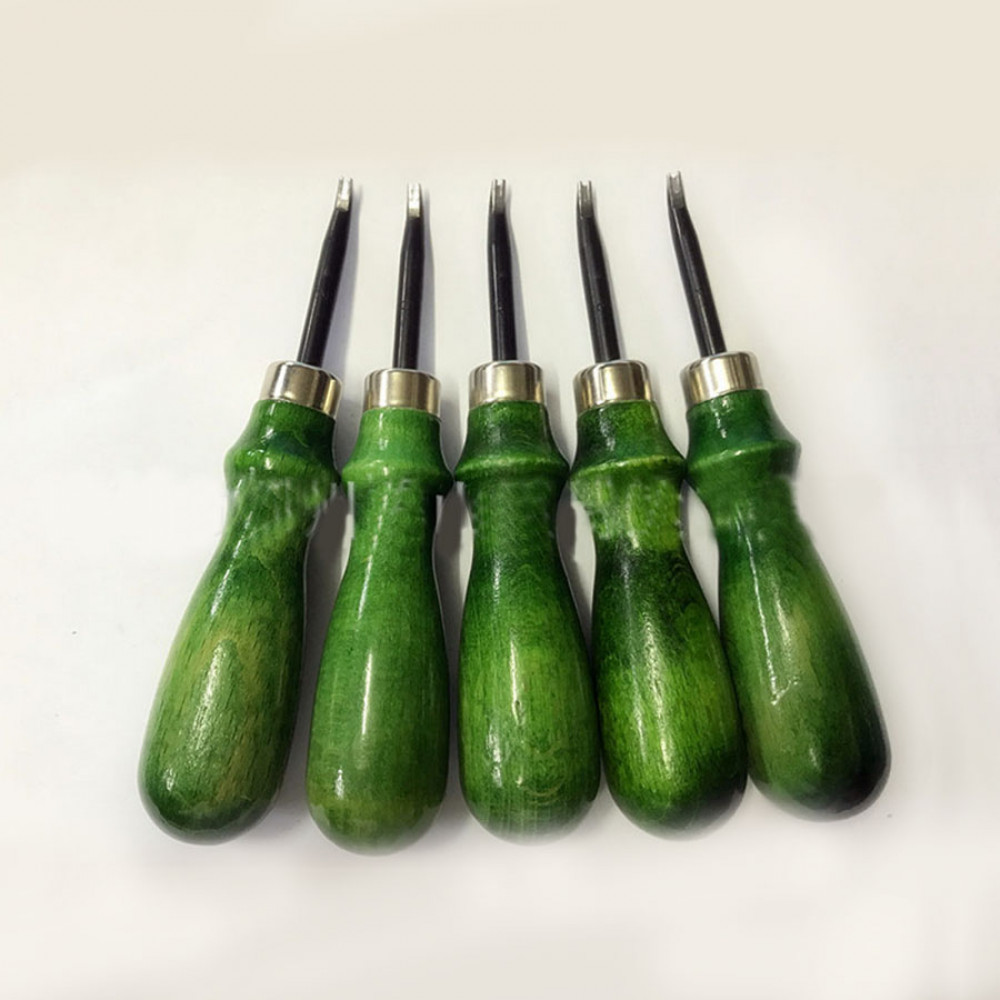 Торцбил (фаскорез) с зеленой ручкой - инструмент для работы с кожей с плоским резом. Инструмент позволяет снять фаску с торца кожи. Зауженный кончик грувера позволяет работать с тонкими кожами, загнутый кончик позволяет контролировать угол реза.